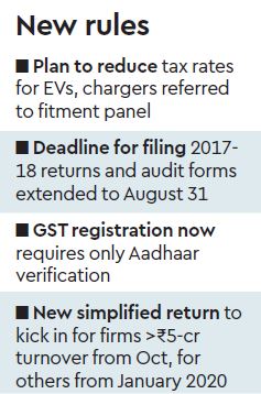Also, the council extended by two months the last date for filing annual returns and audit forms (GSTR-9, 9A and 9C) for 2017-18 to August 31, 2019. The proposed simplified return-filing mechanism would be mandatory for businesses with turnover above Rs 5 crore from October, while it would be rolled out for all by January 1, 2020.