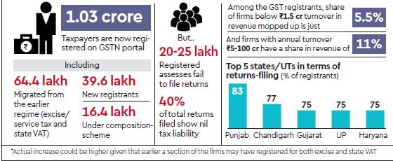 GST has increased the relevant tax net by more than a half* going by the number of businesses registered. However, since a quarter of the GST registrants doesn’t file returns or pay tax and 40% of the filers claim nil tax liability, the tax net may not have been cast as wide as expected.