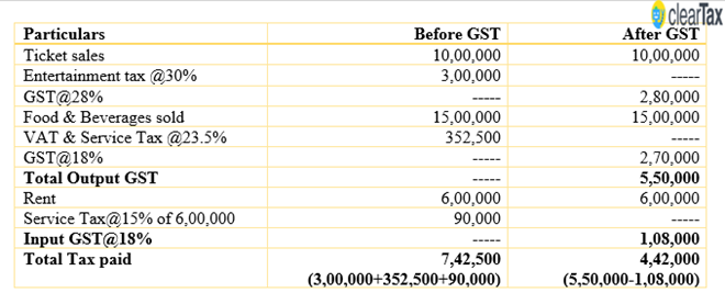 ITC will now be available on the services component of activities like catering, renting of premises for movie halls, security costs which were not available under the pre-GST regime. So, the input GST paid when renting a premise can be adjusted with the output GST from selling tickets.