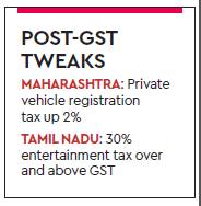In the first week after the roll-out of the goods and services tax (GST), Maharashtra and Tamil Nadu have tweaked local taxes other than those needed to be part of GST legally. This, many analysts fear, could trigger a trend that could undermine the objectives of the new tax. The GST, which subsumes most major indirect taxes, is designed to reduce cascading of taxes that jacks up costs to businesses. Prevalence of input taxes that cannot be offset by the downstream industries is against the GST’s basic tenet. While Maharashtra has raised the one-time registration tax on private two-and four-wheelers by 2%, city corporations in Tamil Nadu have imposed 30% entertainment tax over and above the GST rate levied on cinemas. “In principle, the increase in local taxes is a regressive step and does undermine the overall objective of GST, but there is nothing unconstitutional about it as GST allows states freedom over certain local body levies,” Uday Pimprikar, tax partner at EY, said. He added that Tamil Nadu’s decision to impose entertainment tax was particularly appaling as it penalises one segment of the business community.