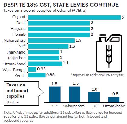 The goods and services tax regime (GST) hasn’t really come as a boon for sugar mills that produce ethanol. The oil marketing companies (OMCs) have asked sugar mills to submit details of the input tax credit (ITC) they get before supplying ethanol for the government’s blending programme, hinting that the ITC amount can be deducted from the price of the bio-fuel payable to the suppliers. Also, the hope that the GST will end all kinds of levies on the inter-state movement of ethanol has been dashed, as states like Gujarat, Delhi, Haryana, Punjab, Maharashtra, Uttar Pradesh, Madhya Pradesh have still not scrapped taxes on inter-state movement of taxes (see the chart), frustrating the notion of ‘one nation, one tax’. In a letter to sugar mills, the OMCs have said: “…As per anti-profiteering provisions under Section 171 of the GST Act, it is mandatory for suppliers to pass on the benefit due to reduction in the rate of tax or from the ITC to the consumer by way of commensurate reduction in price.” “Hence you are requested to give a declaration with details of input taxes forming a part of basic price which are subsumed in GST, duly certified by auditor/statutory auditor of your company, on the elements of input taxes,” the letter said.