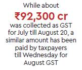 While about Rs 92,300 crore was collected as GST for July till August 20, a similar amount has been paid by the taxpayers till Wednesday for August GST, sources said. To make things easier for the business, the GST Council had extended the last dates for filing detailed returns — GSTR1, GSTR2 and GSTR3 — but businesses need to pay the tax with GSTR-3B filing. However, the slow pace at which even the interim returns are being filed is vexing the government — a TV channel reported that finance minister Arun Jaitley has asked the Central Board of Excise and Customs to submit daily reports of GST filings. With the GSTR1 for outward supplies for the month of July can now be filed until October 10 and GSTR2 for inward supplies by October 31, the government is now putting in place an interim arrangement for refund of taxes to exporters, as waiting for these funds for longer periods could hit the liquidity of thousands of exporters. Pandey said that some assessees were still filing return for July along with August. For July, there were nearly 60 lakh eligible taxpayers and this number must have moved up for August and new registrants are being added.