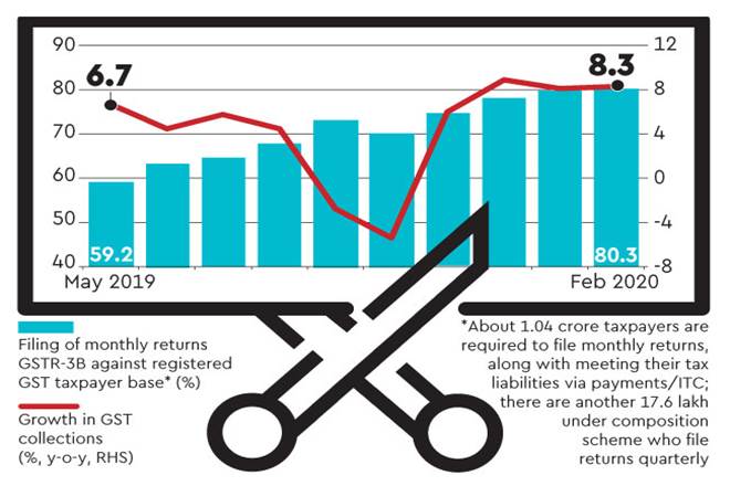 The compliance rate of monthly returns filing by the registered taxpayers rose to over 80% in February (for January transactions), from just 59% in May 2019. Since the filing of the GSTR 3B, the monthly return, involves discharge of the self-assessed tax liability, the increase in filing of these returns has pushed up collections, especially in the four months to February (see chart).