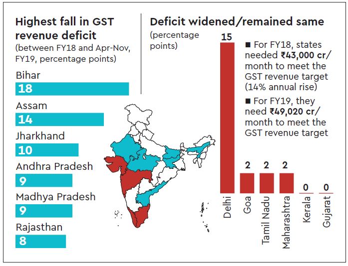 Despite the series of rate cuts since its July 2017 launch, the shortfalls in GST collections seem to be bridging for many states, in what indicates an improvement in compliance. As a result, the overall GST revenue deficit for states has come down to 10% in April-November 2018 from 20% in the August 2017-March 2018 period, data gathered by FE showed. (The deficit is reckoned against the 14% y-o-y growth target set under the GST compensation law).