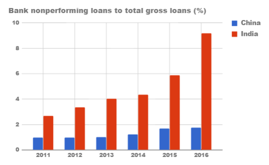 In 2016, India’s loan defaults were at 9.2% of the total gross loans, while that of China stood at just 1.7%, according to the World Bank data on nonperforming loans. And while in 2017 so far, India has inched closer to the 10% mark in terms of bad loans as a proportion of the total, China has stayed a tad below 2%. A loan becomes non-performing or bad when a borrower stops repaying either the principal amount or the interest.