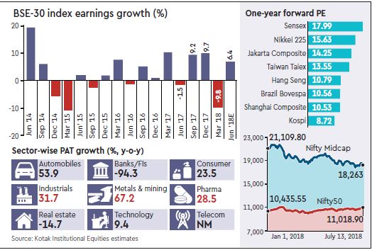 Kotak Institutional Equities believes the net income in Q1FY19 for its coverage universe will be flat year-on-year while for the BSE 30 companies, the growth is pegged at just 6% y-o-y.