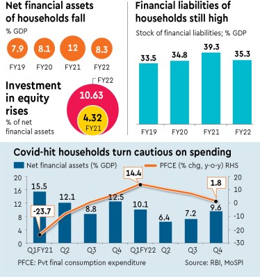 In an expected trend, the net financial assets of households fell to 8.3% of GDP in FY22 from 12% in FY21. As experts have pointed out, consumption was constrained during the pandemic by limited mobility, and consumers were compelled to save. With life more or less back to normal in the second half of 2021-22, the spends too normalised with pent-up demand being released. This is clearly reflected in the numbers with assets falling by `6 trillion or 19% over 2020-21.