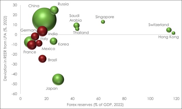 - Moreover, the real effective exchange rate (REER) seems closely aligned with the fair value (as of Dec-22, rupee was just 3.5% overvalued vis-à-vis its long period average as per BIS), in contrast to that in some other nations.