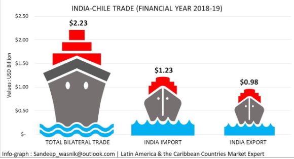 In the financial year 2018-19, India-Chile total Bilateral trade was recorded $ 2.23 Billion, where India exports $0.98 Billion and imports in India from Chile was recorded $1.23 Billion. Infographics show the 5 topmost commodities (In 2 Digit HS Code) Import-Export of India with Chile in the financial year 2018-19.