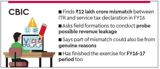 The indirect tax department has detected a mismatch of Rs 12 lakh crore between the income declared in income-tax returns (ITR) on account of services and the value of these services declared in the corresponding service tax details in FY16. The mismatch amount is nearly six times the service tax collected in the fiscal.