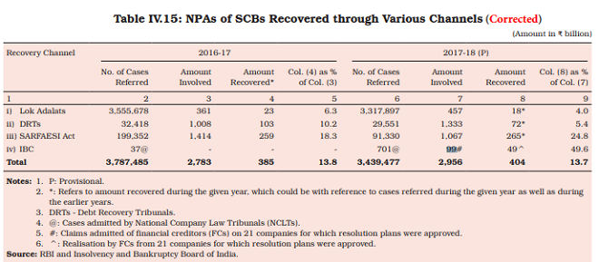 “Recovery of stressed assets improved during 2017-18 through the IBC and SARFAESI. Apart from vigorous efforts by banks for speedier recovery, amending the SARFAESI Act to bring in a provision
