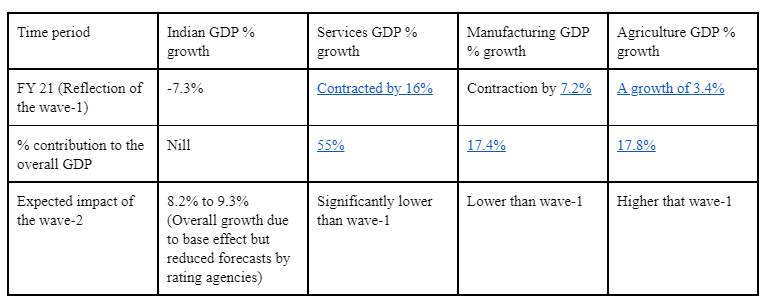 The first wave required a steep learning curve for the organizations to develop infrastructure and processes for remote working. For the employees, first wave lockdowns were a new paradigm and it took them some time to adjust to work from home and be productive. Prolonged lockdown and unlocking phases during the first wave ensured that both the employer and employee got into a rhythm and the productivity started reaching pre-covid levels. The second wave disrupted this rhythm. But the impact of the second wave has been localized and centered around groups of people with typical disruptions costing 3-4 weeks of productivity. My assessment is that the services sector will be the least hit from wave 2 from an output standpoint.