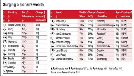 The number of billionaires in the world grew by more than one a day in the last one year, while China produced four new billionaires every week, says a new study by the Shanghai-based Hurun Report, which has been ranking the rich in the world for the last seven years. Hurun Report on Wednesday released the Hurun Global Rich List 2018, a ranking of the US-dollar-billionaires in the world. Interestingly, India climbed back into the third spot, replacing Germany, with 131 billionaires. The Hurun Global Rich List 2018 ranked 2,694 billionaires from 68 countries and from 2,157 companies. Total wealth increased by a staggering 31% to $10.5 trillion, equivalent to 13.2% of global GDP, and almost double the 7% of global GDP six years ago. Rupert Hoogewerf, Hurun Report chairman and chief researcher, said, “Never has so much wealth been concentrated in the hands of so few. It has been an outstanding year for billionaires, 1,508 individuals in the list saw their wealth increase and there were 567 new faces.”