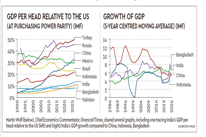 Wolf added that India’s GDP growth at purchasing power parity from 5 per cent (in 1990) to about 15 per cent (by 2025, IMF forecast) has been “pretty well” but incomparable to “China’s spectacular 5 per cent (1990) to 35 per cent (2025) growth story”. India’s “steady growth” (6 per cent a year) peaked at “close to 9 per cent in the early 2000s” but saw “a real collapse” last year. “Among the developing countries, India had a really, really bad negative hit (Bangladesh did astonishingly well),” he stated.