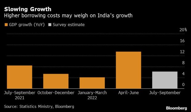 India’s economy probably expanded at a slower pace last quarter as price pressures, rising interest rates and sluggish trade tempered demand in Asia’s third largest economy. Gross domestic product is estimated to have risen 6.2% in the three months to September from a year ago, according to a Bloomberg survey of economists, cooling from a 13.51% growth reported in the previous quarter. Still, an expansion at the 6% level is faster than most of the quarterly outcome since 2019, according to compiled data.