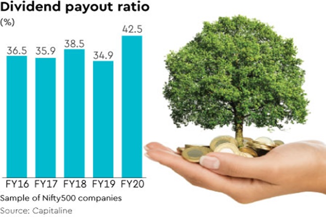 The dividend payout for the Nifty 500 universe has risen to 42.5% in 2019-20 — the highest in at least seven years, data from Capitaline shows. While the top 500 companies distributed 34.9% of their earnings as dividends in 2018-19, the ratio for 2017-18 was higher at 38.5%. The five-year average through FY19 is 36.4%.