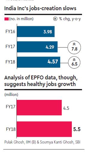 Even those who don’t accept the Ghosh & Ghosh analysis would agree there have been a lot more jobs created in the formal economy, thanks to policies like GST. The number of businesses registered with the GST authorities have risen from 8.6 million in July 2017 to 11.6 million in November, 2018; of these, 5.6 million were new assessees. Also, with several sectors in trouble, the government had come up with schemes to boost employment like sharing part of the EPFO burden. According to official data, around 10 million people were registered under the Pradhan Mantri Rojgar Protsahan Yojana since April, 2016. Once again, though, these would not necessarily be new jobs but could be units choosing to get into the formal sector.
