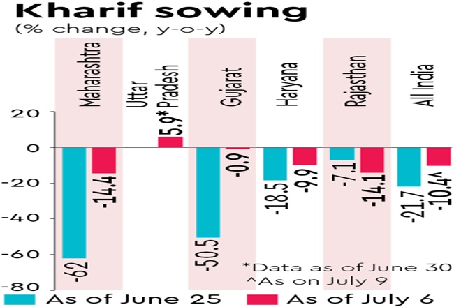 Farmers in Haryana, which has 89% irrigated land, have already completed sowing in over half of the normal area of 3.02 million hectare, as of July 6, despite 33% lower than normal rains, until July 10. The sowing activities are likely to get a boost with the revival of monsoon. The deficit gap in Gujarat’s sowing area narrowed down significantly as it is just 1% below last-year’s level, whereas acreage was (-) 50% a fortnight back. The state has reported crops coverage (as of July 5) in 47% of the normal area of about 8.5 million hectare.