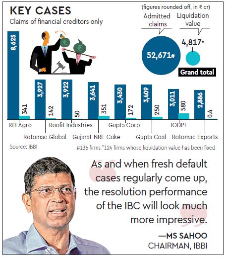 Commenting on liquidation, IBBI chairman MS Sahoo told FE: “The not-so-good results in the initial set of cases is no indication of the performance of the IBC. As and when fresh cases of defaults regularly come up for being admitted, the resolution performance of the IBC will look much more impressive.”