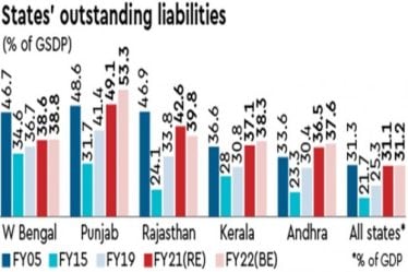 The aggregate debt of states reached a 15-year high of 31.3% of GDP in FY21 and is seen to be at roughly the same level in FY22. According to the respective budget estimates, states with the highest debt-GSDP ratio in FY22 are Punjab (53.3%), Rajasthan (39.8%), West Bengal (38.8%), Kerala (38.3%) and Andhra Pradesh (37.6%). All these states receive revenue deficit grants from the Centre.