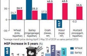 In the case of five crops FE analysed, rabi MSPs in 2019 (April 1-May 10) were 25-46% higher than prevailed five years ago, but only in case of three of these crops (wheat, barley and gram), mandi rates were higher than five years ago (15-57%) whereas in the case of the other two (masur and mustard), the market rates in the current season remained below the corresponding levels five years ago.