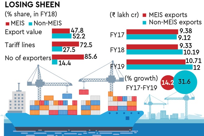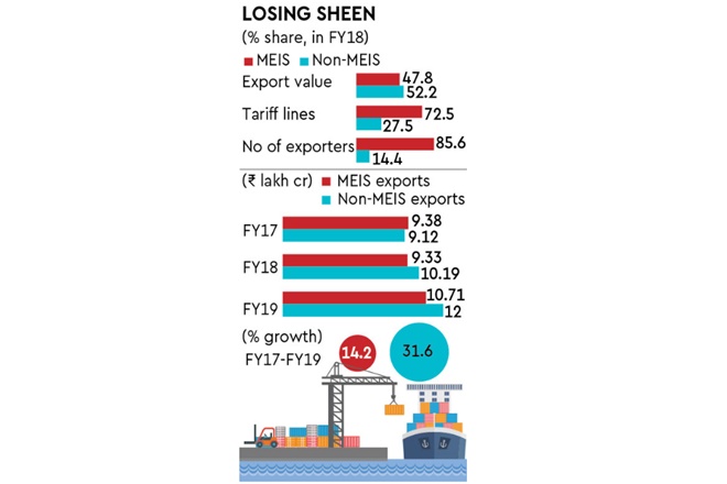 Even as India’s export promotion schemes have been under attack for several years in multilateral forums for their subsidy content, these have also been a disincentive for firms to grow. Consider the latest variant, the Merchandise Exports From India Scheme (MEIS), which is already on its way out. Between FY17 and FY19, while exports covered under the MEIS grew just 14.2% in rupee term, non-MEIS shipments rose at a much faster pace of 31.6%, according to an FE analysis.