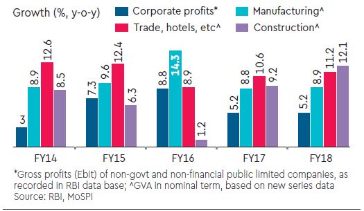 The ministry also argued that the blowing up (of data) anyway doesn’t materially affect the year-to-year GDP growth, as much as the level of GDP. However, an analysis of some 3,000 non-financial and non-government listed firms tracked by the Reserve Bank of India shows a stark difference between their profitability and the growth in gross value added (GVA) in manufacturing as well as services segments under the new GDP series in recent years (see the chart).