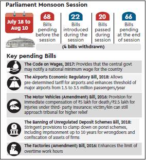 Other important pending Bills include the Banning of Unregulated Deposit Schemes Bill, 2018, the Factories (Amendment) Bill, 2016, the Chit Funds (Amendment) Bill, 2018, the Consumer Protection Bill, 2018 and the National Medical Commission Bill, 2017.