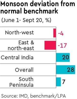 The cumulative monsoon rainfall received in all the four regions during June 1-September 20 was 878 mm, 7% more than the long-period average (LPA) of 822 mm for the same period. However, the distribution of rainfall has been rather uneven. The rainfall deficiency in the east and north-east, and north-west regions have been 17% and 4%, respectively, so far, while central India and the south peninsula have received 20% and 28% more rainfall than the LPA.