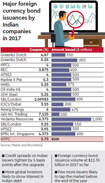 Jayesh Mehta, MD and country treasurer, Bank of America, pointed out that Indian bonds had already been trading at a notch above the country rating. “Given that potentially more investors will now be eligible to invest in Indian paper, the spreads could go down further,” Mehta said, adding an immediate contraction had already been seen. Borrowers from India have so far mopped up $12.3 billion by way of foreign currency bonds; this compares with a total of around $11 billion in 2016. Moody’s on Friday upgraded its local and foreign currency issuer ratings for India to Baa2 from Baa3, with a stable outlook, from positive. Bond and currency expert Ananth Narayan said credit spreads for Indian bonds should tighten. “As a follow through, real investor appetite for India and Indian issuers risk should improve, given Moody’s now rates us two notches above junk,” Narayan said.