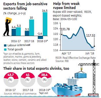 The fall presents a new worry for policy-makers already grappling with options to contain the fallout of an escalating global trade war, and also partly explains why not enough jobs are being seen to have been created. Although a weak rupee is expected to offer some cushion, analysts say the domestic currency is still over-valued by over 17% vis-à-vis a basket of 36 export-sensitive currencies; so the benefit tends to be limited. A further depreciation of the rupee will help only if the currencies of competing exporting countries hold up against the dollar.