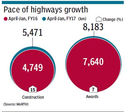 The ministry has targeted to build 15,000-km highways in the current fiscal. In 2015-16, total highways construction was 6,061 km only. It has built 5,471 km highways in the April-January period of the current fiscal. Of the total construction till January-end, projects directly implemented by MoRTH was 3,466 km, against 3,217 km a year ago. NHAI constructed 2,005 km in the first ten months of this fiscal, compared with 1,532 km in the corresponding period last fiscal.