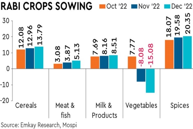 While food inflation fell to 4.19% in December, the lowest since January 2022, thanks to a sharp fall in prices of vegetables, edible oils, meat products and pulses, the prices of several commodities such as spices, cereals and dairy products continued to be at elevated levels amid supply contraints.