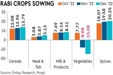 “It is not a broad based decline in food inflation, the fall is due to the most volatile part of the basket, that is vegetables,” DK Joshi, chief economist, Crisil told FE. Joshi said there remains stickiness in other components such as cereals where the wheat crop got hit last year while rice production is likely to decline this year. Wheat and rice inflation was at 22.2% and 10.49% respectively in December 2022 on year.