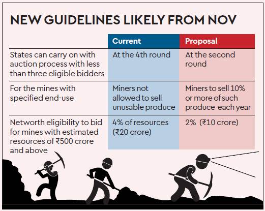 “With no takers for most mines, changes in the rules have become imperative. The sooner these changes are done, the better,” said an industry source who does not want to be quoted. Sources from the mines ministry said the new rules will become effective in November. The changed rules will help speed up the auction process, they added. Once the rules are revised, miners will be able to sell at least 10% of the end-use-restricted minerals every year, the sources said, adding, the limit might even be raised to a higher level. The firms can also accumulate the reserves till the fifth year and sell the the unusable produce in the sixth year subject to the cap.