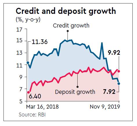 Deposit growth in the banking system fell to 9.92% y-o-y to Rs 129.99 lakh crore during the fortnight ended November 9. During the comparable fortnight of 2018, deposits with banks had grown by 9.14%. The credit deposit (CD) ratio for the fortnight stood at 75.14, down from 75.27 in the previous fortnight.