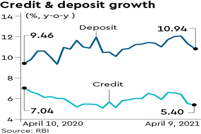 Growth in non-food credit fell further in April, clocking 5.4% year on year (YoY) for the fortnight ended April 9 from 5.54% YoY in the previous fortnight. Slower growth in credit coincides with a fresh surge in coronavirus infections across India, which has led to bankers turning wary about lending.