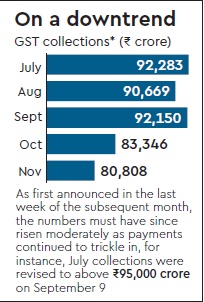 The chances of at least a modest fiscal slippage for the Centre in 2017-18 appeared increasingly likely on Tuesday, after official data said November goods and services tax (GST) collections were just Rs 80,808 crore, down from around Rs 83,350 crore revenue garnered in October till the corresponding reporting time, and much lower than a comparable monthly average of close to Rs 92,000 crore in the July-September period. Analysts attribute the dip in collections to the GST rate cuts for as many as 200 items on November 15 — 130 items had seen rate reductions earlier — commencement of refunds to exporters and settlement of transitional credits. However, a fall in compliance need also to be suspected given that among the nearly 1 crore GST Network registrants, only 53 lakh had paid November taxes when last reported. Even after excluding 17 lakh units that opted for the nominal-tax scheme, which allows quarterly tax payments, at least 20 lakh haven’t paid November taxes so far. In no month since GST’s launch has the taxpayer count exceeded 60 lakh. The Centre’s indirect tax collection target for the current financial year is Rs 9.26 lakh crore, which includes Rs 72,150 crore to be generated from basic customs duty (which co-exists with GST) and a substantial amount from taxes on petroleum products that are outside GST. The monthly revenue-neutral GST collections for the Centre is reckoned to be around Rs 45,000 crore.