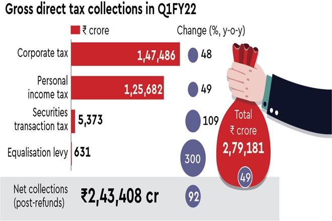 The gross direct tax collections include corporation tax (CIT) at Rs 1,47,486 crore in Q1FY22, an increase of 48% over Rs 99,963 crore collected in the year ago period. The gross personal income tax (PIT) at Rs 1,25,682 crore as on June 30 of FY22 was 49% higher than Rs 84,267 crore crore collected in the year-ago period. Refunds amounting to about Rs 36,000 crore were issued in Q1FY22. It was much lower than the refunds issued in the corresponding period in FY21.