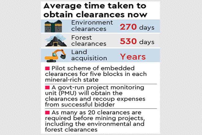 A government-level project monitoring unit (PMU) will be tasked with the mandate to obtain the clearances – in fact, the PMU will be the applicant for the assorted clearances required for a mining project. All expenses related to the approvals will be recouped from the successful bidders later. As many as 20 clearances are required before the mining can start, including the environmental and forest clearances, and the approval process is tedious. On an average, environmental and forest clearances take 270 and 530 days respectively, at present.