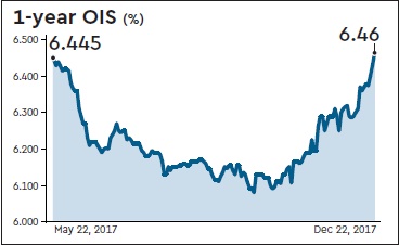 MS Gopikrishnan, head of FXRC trading, South Asia, Standard Chartered Bank, points out that bond yields have been rising on the back of supply overhang from open market operations (OMO) sales by the RBI, fiscal slippage worries, rate hike expectations, etc. “This is also reflected in the higher swap rates, as traders look to hedge their bond position through swaps. The swap market is now fully pricing in a rate hike in the first quarter of 2018,” he pointed out. The ten-year benchmark yield closed at a 17-month high of 7.27% on Friday. Bond traders have been cautious over the past few days, as mixed reports have kept the market volatile. On Thursday, traders interpreted the minutes of the monetary policy committee (MPC) meeting as more hawkish than what was seen in the previous meeting. This led to a sharp sell-off in the market.