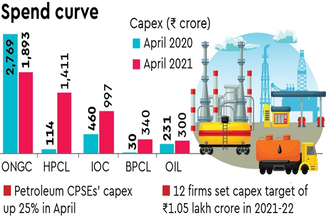 Refiner-cum-retailer Hindustan Petroleum Corporation (a subsidiary of ONGC), which has lined up a Rs 14,500 crore capex plan for 2021-22, achieved 9.7% of that in April this fiscal compared with a paltry 1% of the relevant target achieved in the year-ago month.