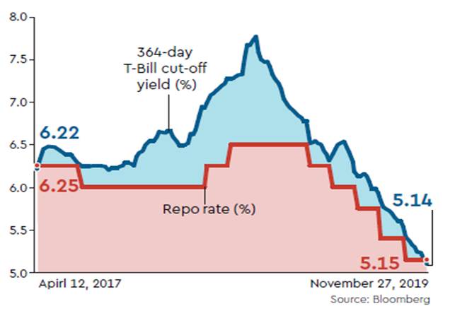 In an indication of how risk-averse banks are, the yield on the 364-day T-bill auctioned on Wednesday came in at 5.1389%, below that of the repo rate of 5.15%. Bloomberg data show this last happened in April 2017 or more than over two and a half years ago.