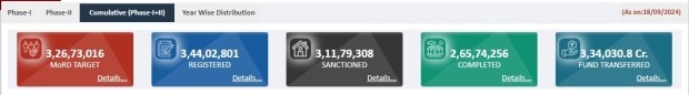 According to data provided by the official website of PMAY-Grameen, 3,11,79,308 houses have been sanctioned and 2,65,74,256 houses have been completed.