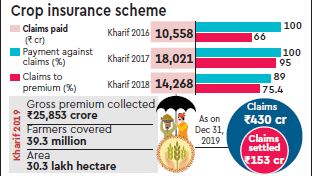 Even as sowing for the winter crop 2019-20 is about to conclude, settlement of crop insurance claims pertaining to the last kharif season is progressing at a tardy pace. Until December 31, the total claims honoured by insurers for kharif 2019 crop damages reported by farmers under PM Fasal Bima Yojana (PMFBY) were just Rs 153 crore, while the previous summer crop saw insurance payouts to the tune of Rs 14,500 crore.