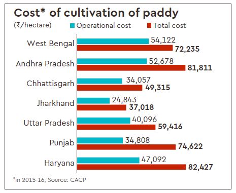 The cost of cultivation widely varies from state to state. For instance, operational costs that include labour, fertiliser, pesticides, irrigation of paddy is Rs52,678/hectare in Andhra Pradesh and Rs24,843/hectare in Jharkhand, according to data from the Commission for Agricultural Costs and Prices. Total costs (C2) are even higher as they include rental value of owned land, interest on fixed capital and land revenue.