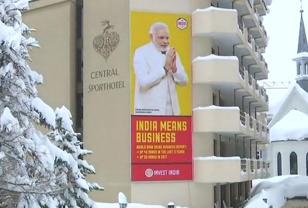 2: 40 pm: Poster of PM Narendra Modi seen in Davos. He will be addressing plenary session tomorrow.