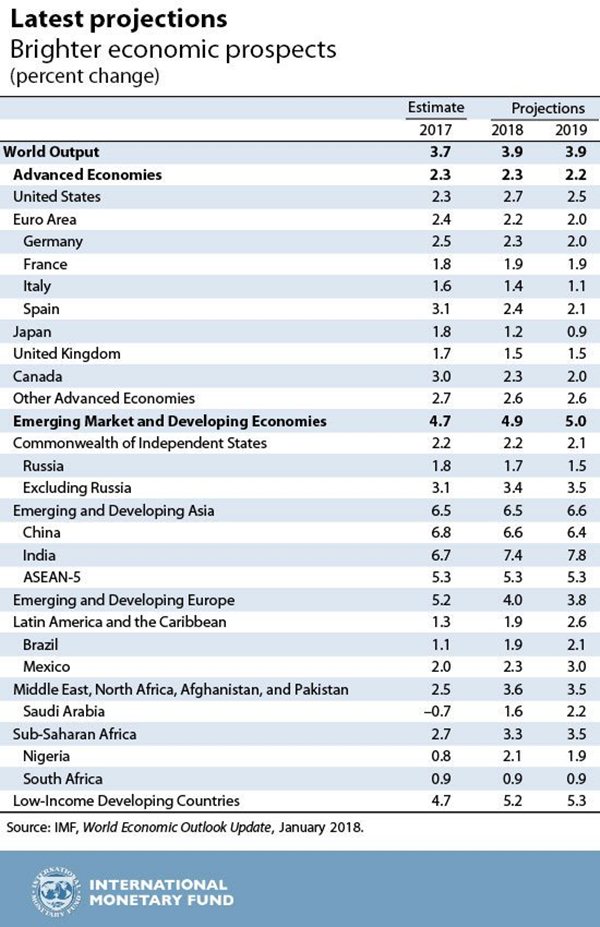 9: 26 pm: The world economy is gathering speed with growth forecast for 2018 and 2019 pegged at 3.9 per cent, the IMF said today but warned that the present economic momentum reflects a “confluence of factors” that is unlikely to last for long. In its latest World Economic Outlook (WEO) update released today in Davos, Switzerland on the sidelines of the World Economic Forum, the IMF said global output is estimated to have grown by 3.7 per cent in 2017, which is 0.1 percentage point faster than projected in the fall and half percentage point higher than in 2016.
