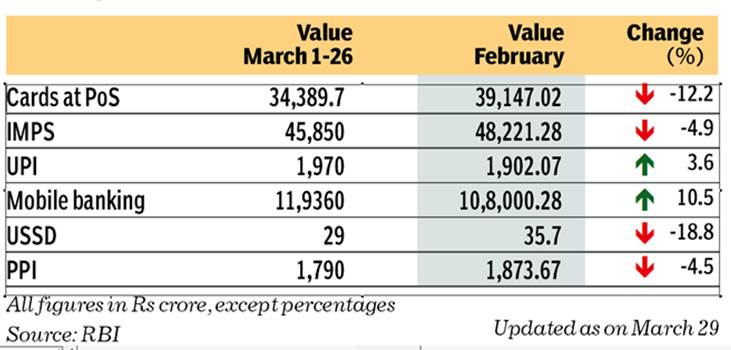 The two modes which bucked the trend were Unified Payments Interface (UPI) and mobile banking, which grew 3.6% to R1,970 crore and 10.5% to R1,19,360 crore, respectively. Data for mobile banking transactions is sourced from five banks. Debit and credit card transactions at PoS terminals in March added up to R34,389.7 crore, while the corresponding figure for November was R35,235.97 crore, representative data sourced from four banks and released by the Reserve Bank of India showed. The value in March is 12.2% lower than that for entire February.
