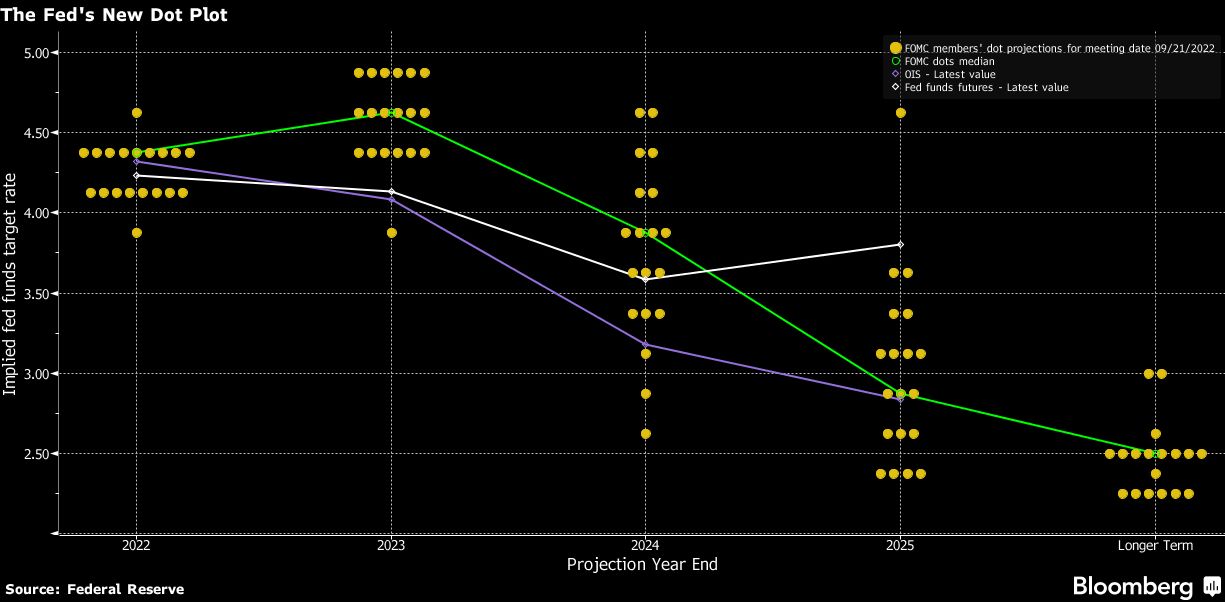The Fed’s quarterly projections, which showed a steeper rate path than officials laid out in June, underscore the Fed’s resolve to cool inflation despite the risk that surging borrowing costs could tip the US into recession. Interest rate futures showed investors betting rates would peak around 4.6% in early 2023.
